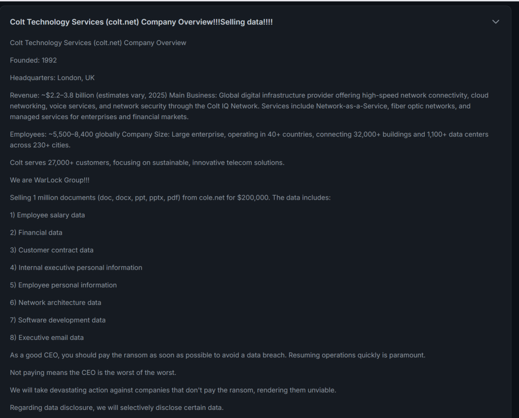 Colt had a cyber-attack in August which is still severely impairing their services. We don’t care too much now they’re porting at least some numbers again, although publicly they never admitted they weren’t and that they still aren’t fully. We knew about the attack from cyber-security circles a few days before they admitted anything and their conduct since has, in my opinion, been to downplay and mislead. Their oh-so-transparent status page at https://www.colt.net/status/ hasn’t been updated in a few months because they resorted to emailing instead, and the incident page they put up in the interests of “transparency” (https://www.colt.net/go/cyber-incident/ ) has HTML headers preventing indexing by search engines: